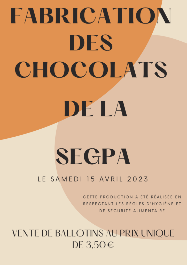 Le samedi 15 avril 2023, à l’occasion de la remise des bulletins, offrez-vous un petit plaisir! Un ballotin de délicieux chocolats fabriqués par nos élèves de SEGPA dans les règles de l’art, et le respect des règles d’hygiène et de sécurité.