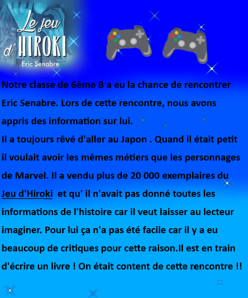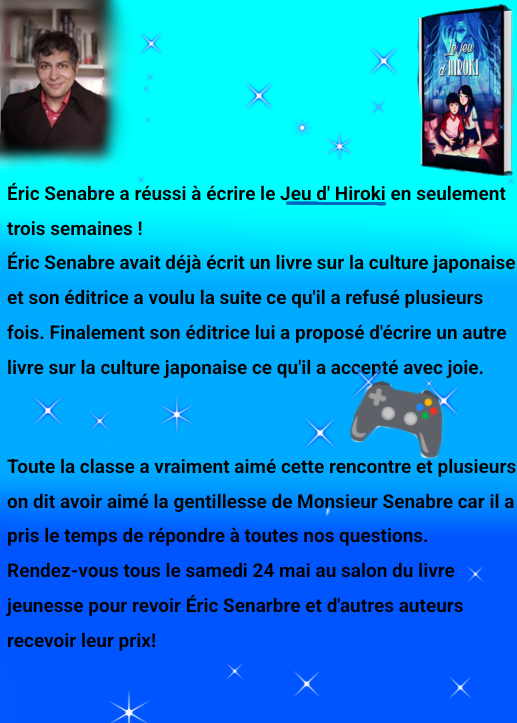 Le vendredi 9 mai dernier les élèves de 6B ont rencontré Eric Senabre. Voici leur récit de cette rencontre, par Alice et Malak