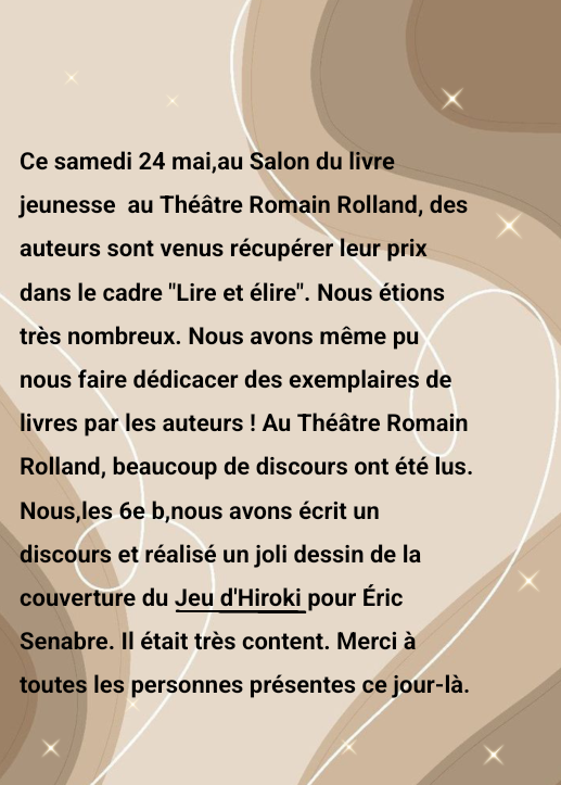 Voici l’article écrit par Malak au sujet de la remise du prix à l’auteur lauréat lors du salon du livre jeunesse le 24 mai dernier