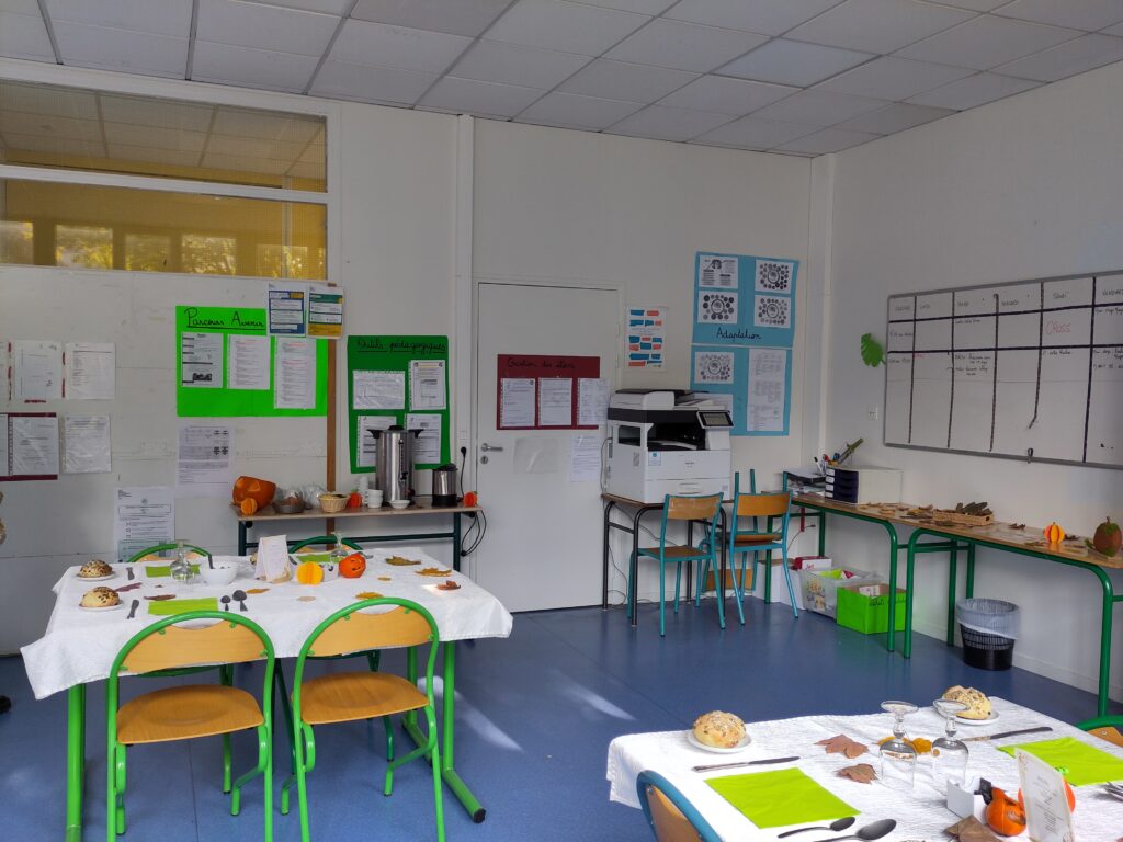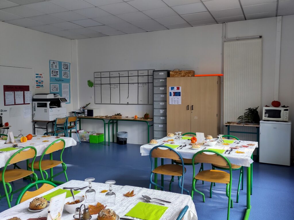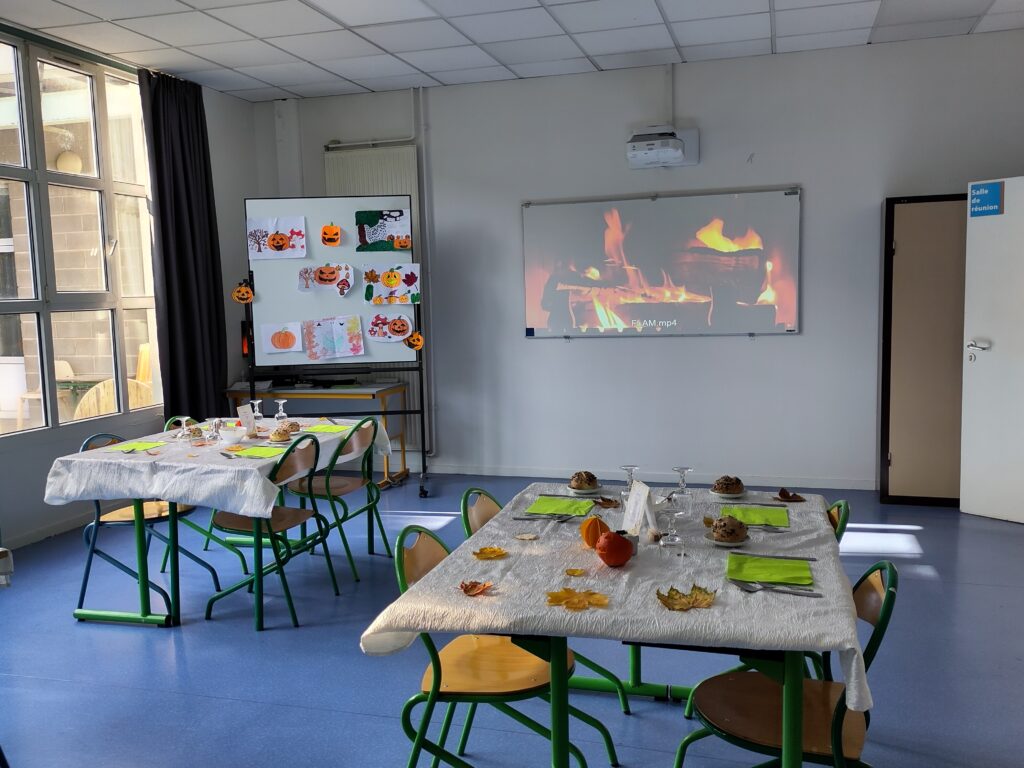 Le premier choc fut visuel, tant la salle de réunion, transformée en restaurant, a été soigneusement préparée. Tout le monde a mis la main à la pâte: 6e, 5e, 4e et 3e. La décoration était soignée, avec des origamis, des dessins, des courges de toutes les tailles, des feuilles… Les tables étaient parfaitement dressées, avec le rappel du menu joliment présenté et un feu de cheminée – virtuel – illuminait la pièce et l’ambiance.