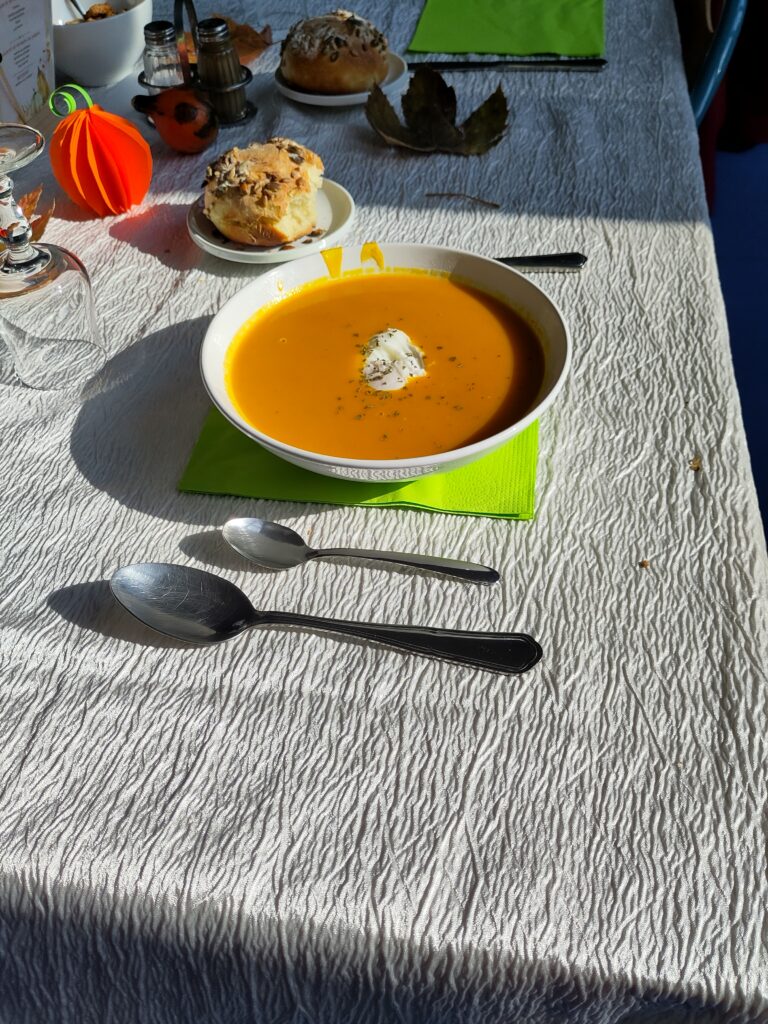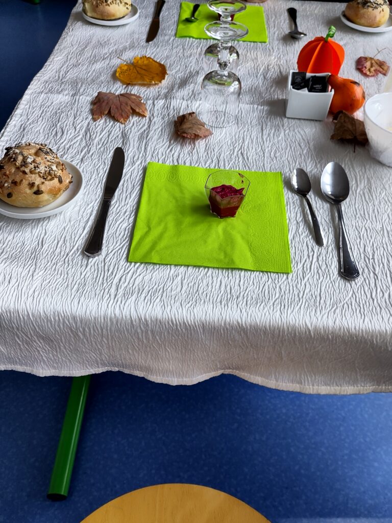 Le second choc fut une explosion de saveur à la dégustation des plats: une mousse de betteraves du potager en entrée, onctueuse et relevée. Mousse suivie d’un délicieux velouté de potimarron à l’œuf poché, que nous pouvions agrémenter de fromage et de petits croutons. Les élèves avaient également préparé de savoureux petits pains aux graines de courge, à la fois croquants et aériens. Une petite touche de douceur pour terminer, avec un moelleux au chocolat que nous connaissons déjà bien depuis l’an dernier et qui réjouit nos papilles à chaque rencontre.